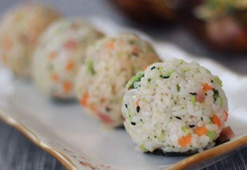 5. 饭团成型:取一片紫菜放在手心,放入适量的糯米饭,再放上蔬菜丁,最后再盖上一层糯米饭,用紫菜包裹紧实。